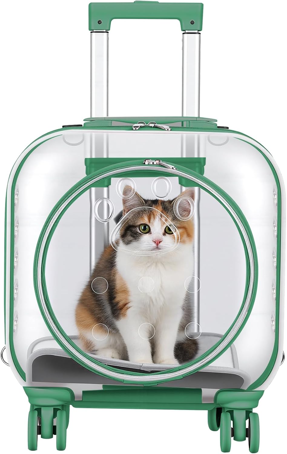 Item Name: Pet Trolley Case/cat carrier with wheels/kitten carrier/dog backpack/Material: PC Features: Fashionable, Portable, Transparent, ComfortableCapacity: Cat Within 5kg, Dog Within 4kg Size Details: L: 43cm/16.93", W: 30cm/11.81", H: 40cm/15.75" (Approx.) Notes: Due to the light and screen setting difference, the item's color may be slightly different from the pictures.Please allow slight dimension difference due to different manual measurement. Package Includes: 1 x Pet Trolley Case