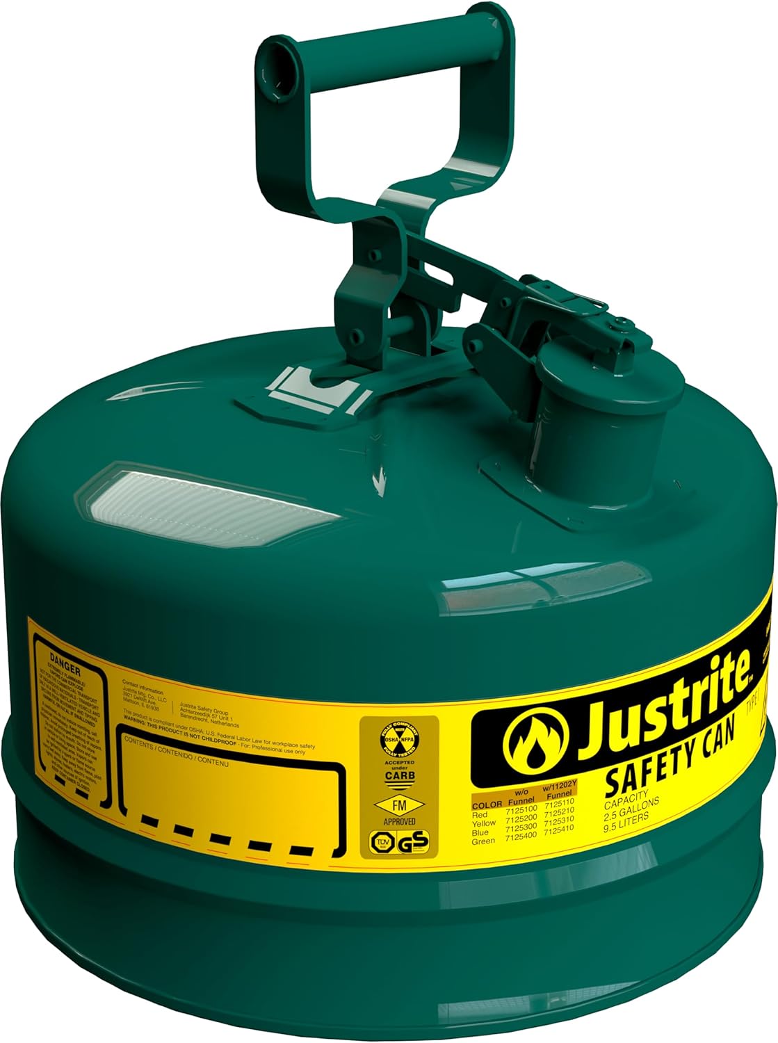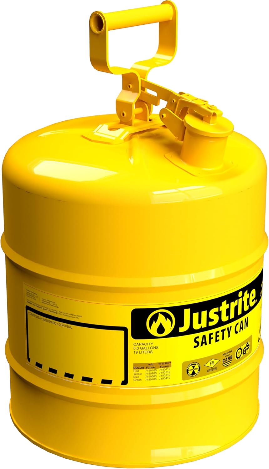 Justrite Type I Safety Cans are the ideal safety can for any home or business. Justrite Type I compliant and economical safety cans reduce fire risks and make everyday use of flammables easier and safer. Designed with a single spout for filling and pouring, the sealed lid features automatic positive-pressure relief that vents between 3 and 5 psig (0.2 and 0.35 bar) to guard against rupture or explosion. Protection features include a 3.5-inches long chemical resistant stainless steel flame arrester that stops flashback ignition, provides faster liquid flow, and offers exceptional durability. The self-venting, self-closing leakproof lid prevents ruptures from pressure build-up and controls vapors and spills. Warning label includes an extra large ID zone for user labeling of contents to avoid misuse, reduce the potential for incompatible mixtures, or may be used to designate department or individual owner. Made of galvanized steel with a tough powder paint finish, each can is tested to guarantee 100% leakproof construction. The tough powder-coat finish resists chemicals and stands up to demands of rigorous use. Faster liquid flow. Identify contents to reduce misuse or incompatible mixtures. Designate department location, work shift, crew or individual user. Meets OSHA and NFPA. FM Approved, UL/ULC listed, TUV certified. Founded in 1906, Justrite is the leading storage, handling, and workplace safety product manufacturer. Our flagship product is the Justrite Safety Can, the #1 safety can for storing and transferring flammable liquids.